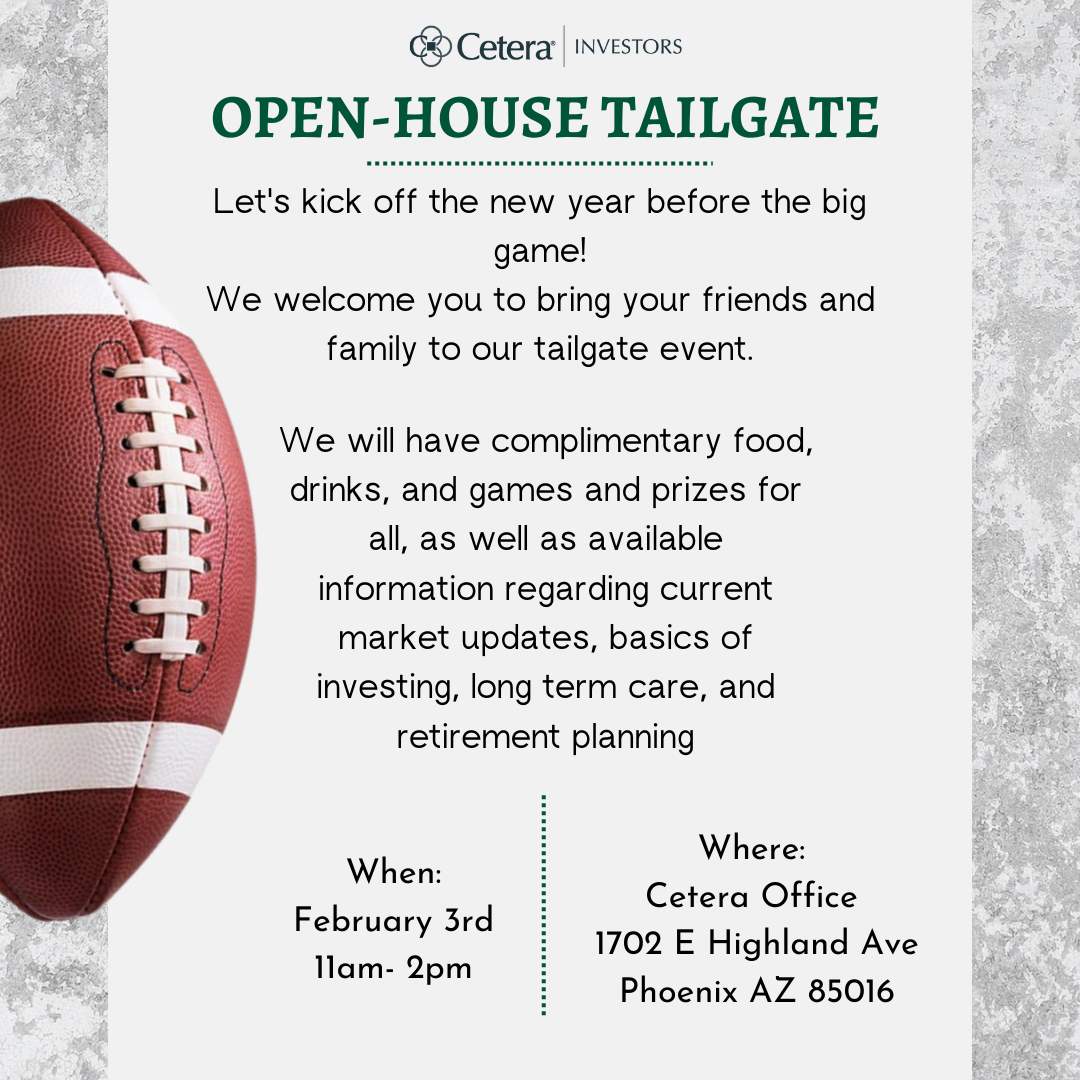 We are hosting an open-house for clients. Please join us for fun, food, and drinks as we close in onSuperbowl Sunday. We will have food trucks, a bounce house obstacle course, and other games for thefamily to enjoy.